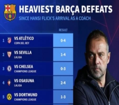 弗里克时代巴萨最大比分输球:04马竞创纪录,仅5场净负至少2球