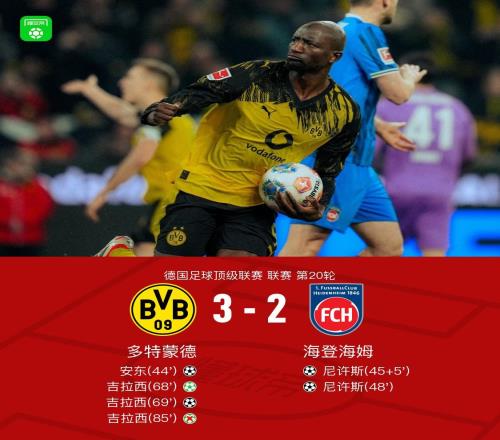 北京时间2月2日德国足球顶级联赛 联赛 第20轮,多特蒙德主场对阵海登海姆。上半场拉马伊脱手,安东破门,之后马内...