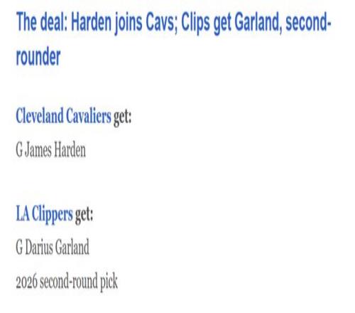 在传出哈登向快船提出交易申请后不到24小时,快船与骑士便迅速围绕哈登与加兰完成2换1交易,具体内容为: