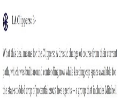 唯一的风险是加兰的伤病问题与矮小的身材,这也是他们仅拿到B-的原因,但快船在如此艰难的困境中找到一条看起来是两全的策略已经实属不易。