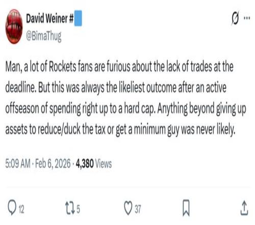 »ð¼ýýÌåÈËDavid WeinerÆØ³öÐݳÇ0½»Ò×µÄÔÒòÖ®Ò»£º¡°Ðí¶à»ð¼ýÇòÃÔÒòΪ½»Ò×½ØÖ¹ÈÕǰÇò¶ÓûÓвÙ×÷¶ø¸Ðµ½·ßÅ£¬µ«¿¼Âǵ½»ð¼ý¶ÓÐÝÈüÆÚÒѾÍê³É¹ý´óÊֱʲÙ×÷£¬Çò¶Óн½ð¿Õ¼äÓÖÊ®·Ö½ôÕÅ£¬³ý·ÇÊÇΪÁ˱Ü˰»òÕßǩԼµ×нÇòÔ±£¬·ñÔò¹ÜÀí²ãµÄȷû±ØÒªÎªÁ˽»Ò×¶ø½»Òס£¡±