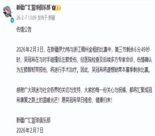 2ÔÂ3ÈÕ£¬Ð½®¶ÔÕóÕ㽵ıÈÈüÖУ¬µÚÈý½Ú»¹Ê£6·Ö49Ã룬Îâ¹ÚÏ£ÔÚÒ»´ÎÎÞ¶Ô¿¹ÂäµØÊ±×óϥͻȻʧÎÈ£¬Í´¿àµ¹µØ¡£¾Ò½Ôº¼ì²éÓë¶àר¼Ò»áÕȷÕïΪ×óÏ¥÷ÆÈÍ´øËðÉË¡ª¡ªÕâÒ»ÉËÊÆÍ¨³£ÐèÒª3ÖÁ6¸öÔ¿µ¸´£¬Òâζ×ÅËû½«³¹µ×¸æ±ð2025-26Èü¼¾¡£
