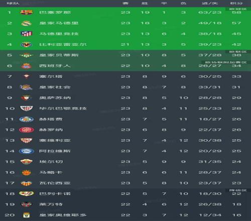 西甲最新积分榜