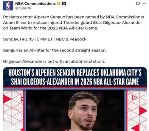 ÓÉÓÚÑÇÀúɽ´óÔâÓö¸¹²¿¼¡ÈâÀ­ÉË£¬È·ÈÏÎÞ·¨³öսȫÃ÷ÐÇ£¬NBA×ܲÃÏô»ªÖ¸¶¨É꾩ÈëѡȫÃ÷ÐÇ£¬ºóÕß½«¶¥ÌæÑÇÀúɽ´ó´ú±í¹ú¼Ê¶Ó²ÎÈü¡£