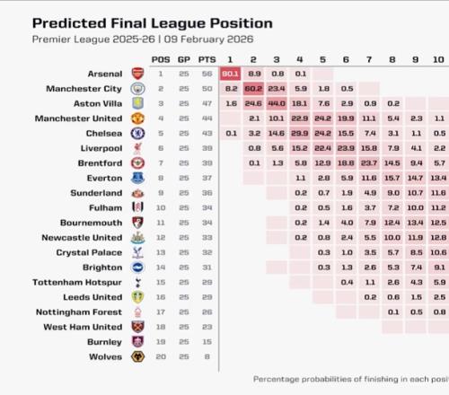 ÌåÓý²¥±¨02ÔÂ09ÈÕÐû Ó¢³¬µÚ25ÂÖ½áÊø£¬°¢ÉÄÉ6·ÖÁìÅÜ»ý·Ö°ñ£¬Âü³Ç¡¢Î¬À·ÖÁжþÈý¡£optaÒ²¸üÐÂÁËÓ¢³¬¶á¹Ú¸ÅÂÊ£¬ÆäÖа¢ÉÄɸߴï90.1%£¬Âü³Ç8.2%£¬Î¬À1.6%£¬ÇжûÎ÷0.1%£¬ÀûÎïÆÖºÍÂüÁªÔòÊÇ0%¡£