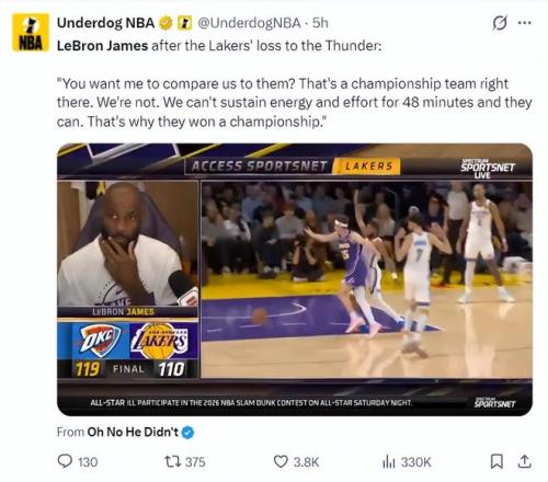 勒布朗-詹姆斯在赛后直言与雷霆的差距很大,他表示,雷霆是总冠军级别的球队而湖人不是,湖人的防守效率联盟第一,从各种数据来看雷霆都是顶尖球队,他们给持球者施加了很多压力,他们有华莱士、卡鲁索、杰威那样的顶级防守球员,我们已经尝试按照计划去执行,但他们的防守可以让我们远离我们喜欢的得分区域。