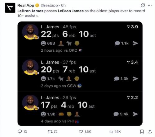 詹姆斯这场比赛拿到22+10+6,连续三场比赛拿到10+助攻是历史最年长的球员,而詹姆斯的言论就是侧面说明湖人阵容孱弱,而且湖人根本没有雷霆那样的防守资源。