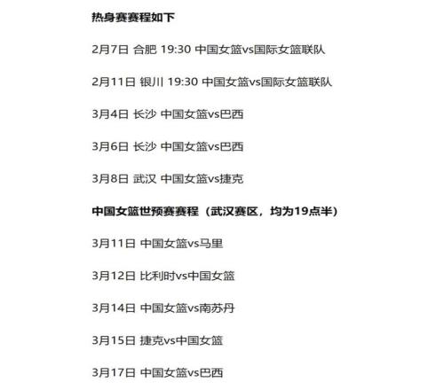 Ã÷ÍíºÍ¹ú¼ÊÁª¶ÓµÄ±ÈÈüÖ®ºó£¬ÖйúÅ®Àº¹ú¼Ò¶Ó½«µÃµ½¶ÌÔݵÄÐÝÏ¢£¬´º½Ú¼ÙÆÚ¡£È»ºóµ½ÁË3Ô¿ªÊ¼£¬Öйú¶Ó½«ÔÚ³¤É³ºÍ°ÍÎ÷¶Ó´ò2³¡ÈÈÉíÈü£¬ÔÚÎ人ºÍ½Ý¿Ë´ò1³¡ÈÈÉíÈü¡£µÈµ½3ÔÂ11ÈÕ¿ªÊ¼£¬ÖйúÅ®Àº¾Í½«¿ªÆôÊÀ½ç±×ʸñÈüÖ®Âá£