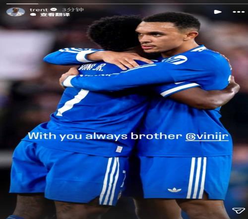 维尼修斯在对阵本菲卡的欧冠比赛中疑似遭到种族歧视,阿诺德社媒晒出与维尼修斯拥抱的照片,配文:“永远与你同在,兄弟。”