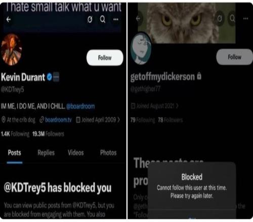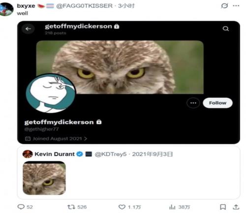 除此之外,杜兰特的大号将这个小号拉黑了,而这个他不认识的疑似小号也将他拉黑了,所以他确定这个账号就是属于杜兰特。并且,该账号的资料背景图片,也曾在杜兰特的大号里出现过(下图的猫头鹰):