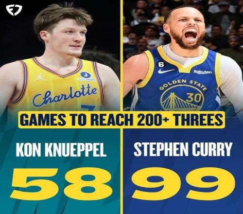 纪录二:克努佩尔58场不仅创造队史最快,也是NBA历史命中200记三分最快的球员,打破邓罗69场的原纪录,相比之下,库里和克莱命中200记三分均耗时99场比赛。