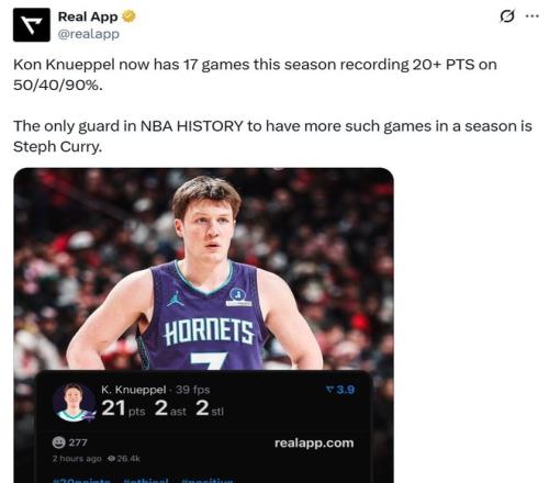 凭借这样的表现,克努佩尔一口气刷新6大纪录,不仅创造NBA历史最快,还比肩三分第一人库里。