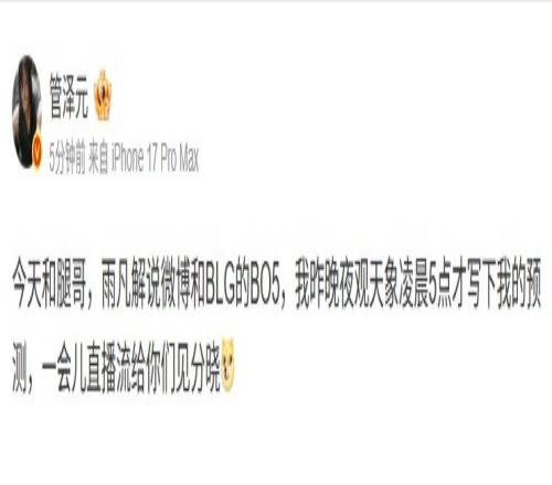 今天和腿哥,雨凡解说微博和BLG的BO5,我昨晚夜观天象凌晨5点才写下我的预测,一会儿直播流给你们见分晓