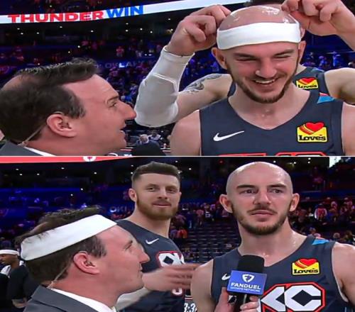 赛后雷霆球员卡鲁索在场边接受队记Nick Gallo的采访。哈尔滕施泰因过来整蛊队记,将卡鲁索的头戴摘下并套在Nick Gallo头上,发带秒变“绷带”。