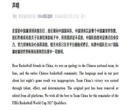 亲爱的中国篮球球迷朋友们,我们谨向中国国家队、中国球迷以及整个中国篮球界致歉。我们昨晚发布的关于比赛结果的帖子中,所用措辞是不妥的。中国队的胜利是通过自身实力、努力拼搏和决心而赢得的。相关内容已在全平台删除或修正。祝愿中国队在2027国际篮联篮球世界杯预选赛剩余比赛中一切顺利。
