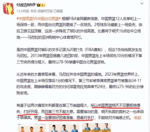 马尼拉并不是中国队的福地,在这个地方中国队曾经两次翻车。2013年男篮亚锦赛八进四阶段,中国男篮在上半场领先10分的情况下第三节突然哑火,最终以78-96惨遭台北男篮逆转。时隔10年,也就是2023年男篮世界杯上,中国队上半场仅落后1分,但第三节又突然哑火,被菲律宾男篮以96-75大比分击败。只能说马尼拉是中国男篮的伤心地。尽管对手是省队,但是国家队来不得半点轻视和大意。