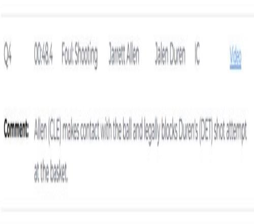 第二次是错判,发生在距离第四节结束还有48.4秒。艾伦在封盖杜伦时,手碰到的是球,这是一次没有犯规的封盖,但裁判吹了艾伦防守犯规,给了杜伦两次罚球机会。这是一次错误的判罚,依然是活塞获利,骑士吃亏。
