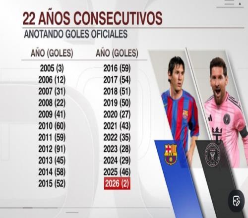 梅西已经连续22个自然年破门,以下为他在这22年进球数分布: