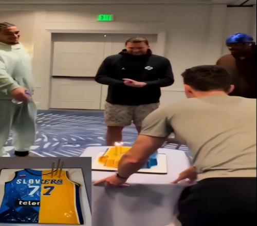 球队也在东契奇真正生日当天为他庆祝,定制了一面是湖人球衣、一面是斯洛文尼亚国家队球衣的蛋糕。被问及生日当天的情况时,东契奇还调侃说队友没有送自己任何生日礼物,太离谱了。
