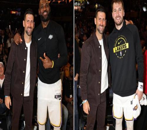 德约科维奇不仅去了东契奇的派对,赛前也现场观战了湖人比赛——在湖人主场和詹姆斯、东契奇在场边合影。