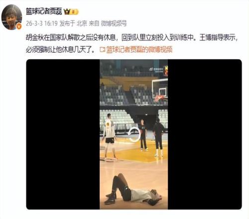 胡金秋回国后,本来可以休息几天(上海国手李弘权就获准长假),但是大秋国家队解散后,马上投入集训。据篮球记者贾磊透露,“胡金秋在国家队解散之后没有休息,回到队里立刻投入到训练中。王博指导表示,必须强制让他休息几天了”。显然勤奋的胡金秋是拒绝了王博的要求,没有休息。从视频看到,胡金秋回到俱乐部后,立刻就训练,有两人陪他训练,如此勤奋,也怪不得他的技术这么好。