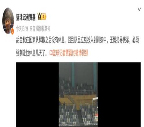 中国男篮打完世预赛后回到北京,球员原地解散回到各自地方队备战下一阶段的CBA常规赛。核心内线胡金秋在返回浙江广厦后选择不休息继续加练,这让主帅王博发愁,他决定强制胡金秋休息,避免过度疲劳的情况发生。