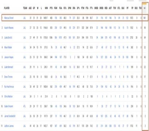 这一战过后,斯马特的赛季总正负值达到了+141,继续在湖人队内断层排名第一。里夫斯+90排名全队第二,东契奇+69排名全队第三,克勒贝尔+52第四,海斯+45第五。詹姆斯本赛季的正负值+2排名第11。湖人队内正负值最低的球员是拉拉维亚,数值为-93,其次是艾顿的-65。