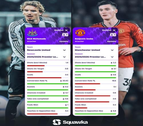 体育播报3月4日宣 本轮英超将迎来曼联对阵纽卡的对决。数据网站Squawka也盘点了两队中锋沃尔特马德与舍什科本赛季英超每90分钟比赛数据: